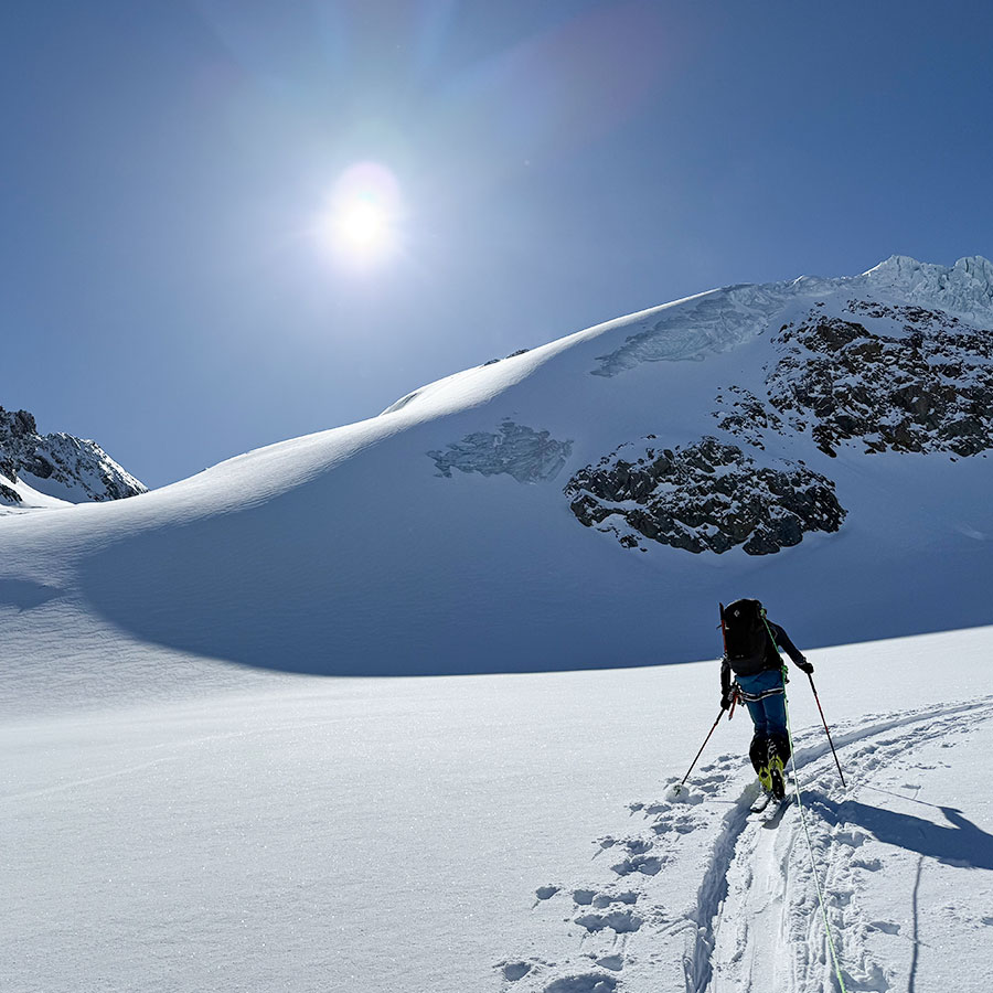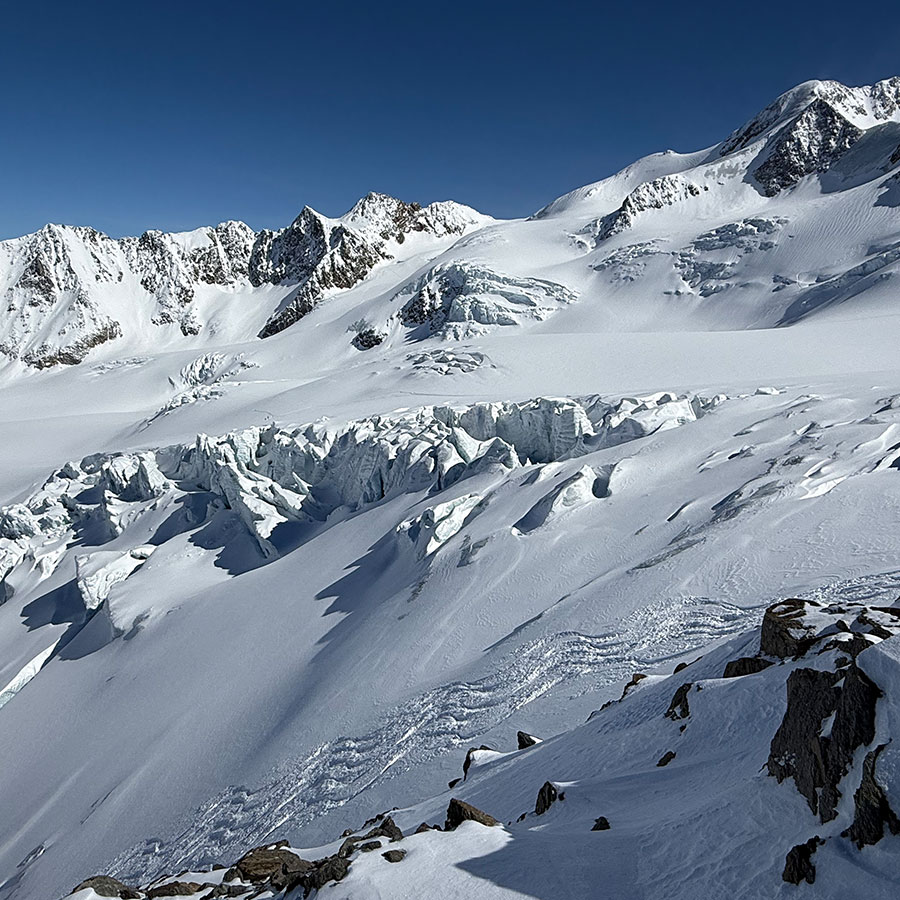 Wir treffen uns um 7:30 in Mandarfen an der Talstation des Gletscher Express. Nach dem Materialcheck fahren wir mit diesem ins Gletscherskigebiet, von wo aus unsere Tour startet. Über den gigantischen Taschachferner geht es Richtung Frühstücksplatzl, die letzten Meter zum Gipfel bewältigen wir zu Fuß. Wenn es die Verhältnisse zu lassen, wählen wir die 2000hm lange Abfahrt über den Taschachferner zurück ins Tal.